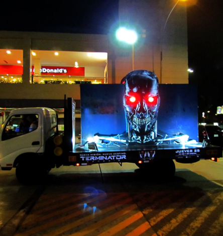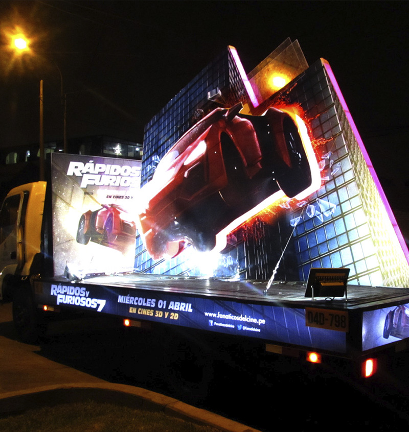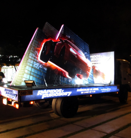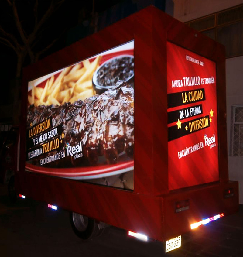 Pantallas digitales móviles que proyectan videos y contenido dinámico, generando alto impacto visual tanto de día como de noche.