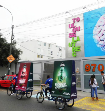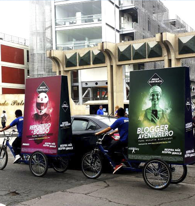 Publicidad en triciclos promocionales que recorren zonas peatonales, ferias y centros comerciales generando cercanía con el público.