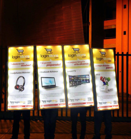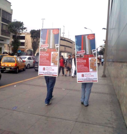 Promotores con carteles publicitarios que interactúan directamente con el público en calles, eventos y puntos estratégicos.